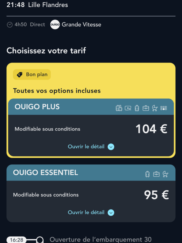 Aller : train BORDEAUX LILLE DIRECT OUI GO DU 27 JUILLET 2024 DEPART 16h58.