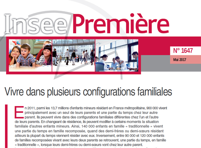 La publication Insee Première qui relate les résultats les plus récents sur tous les grands thèmes de l'actualité économique et sociale, fait un focus sur les différents types de familles dans son n°1647, sorti le 15 mai 2017, titré "Vivre dans plusieurs configurations familiales", sous la direction d'Aude Lapinte et Guillemette Buisson, division Enquêtes et études démographiques, Insee.