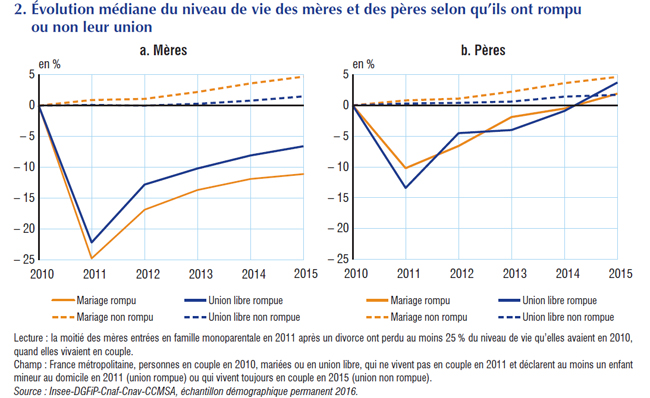 Pour la moitié des pères de familles monoparentales, cette baisse de niveau de vie est au moins supérieure à 10 % l’année de la séparation, et ce, quel que soit le statut conjugal initial.