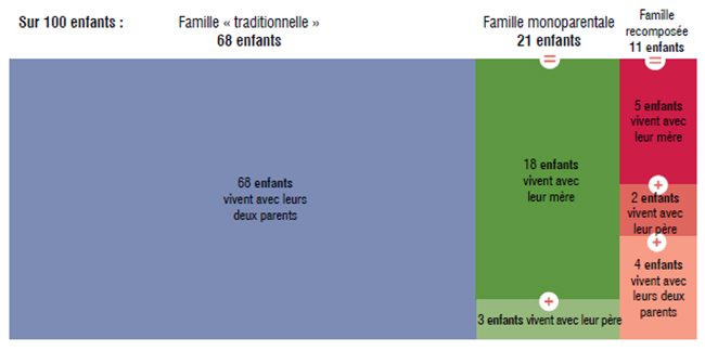 Entre 2011 et 2018, la part des familles "traditionnelles" a diminué (– 2 points), alors que celle des familles monoparentales a cru (+ 2 points) continuant son augmentation régulière depuis 1975, lorsqu'elles représentaient moins de 10 % des familles. La part des familles recomposées est quasiment stable depuis 1999 : un enfant sur dix vit en famille recomposée.