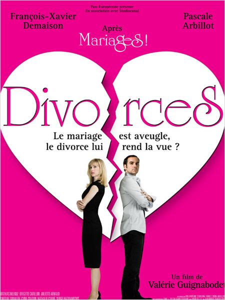 Divorces est le prochain film de Valérie Guignabodet, avec François-Xavier Demaison et Pascale Arbillot dans les rôles principaux. En salles le 14 octobre 2009. Valentine et Alex sont mariés, avocats tous les deux, spécialistes des affaires familiales.